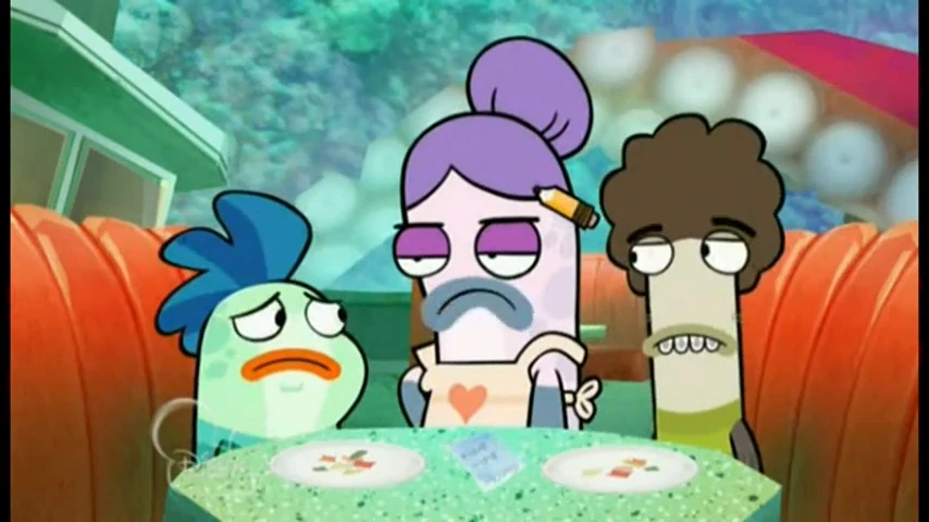 Bassy was first seen when Oscar and Milo tried to hatch up a plan to get to Bea's party, but they cannot think in a empty stomach so they go to the Hokey Poke Diner. When they finished eating, Bassy handed out their checks. Oscar thanks her and says he likes her new hairstyle. She says it's not a new hairstyle, it's a growth, and she swims away crying ("Fish Sleepover Party"). Oscar, Milo, Bea, and Esmargot ordered Flake Shakes, so Bassy gave it to them. When Milo was desperate to get money, he revealed that Bassy has feet. When Chief told Milo they don't need help when he needed a job at the Hokey Poke, Bassy showed Chief how many customers there were at the Hokey Poke ("Dollars and Fish").